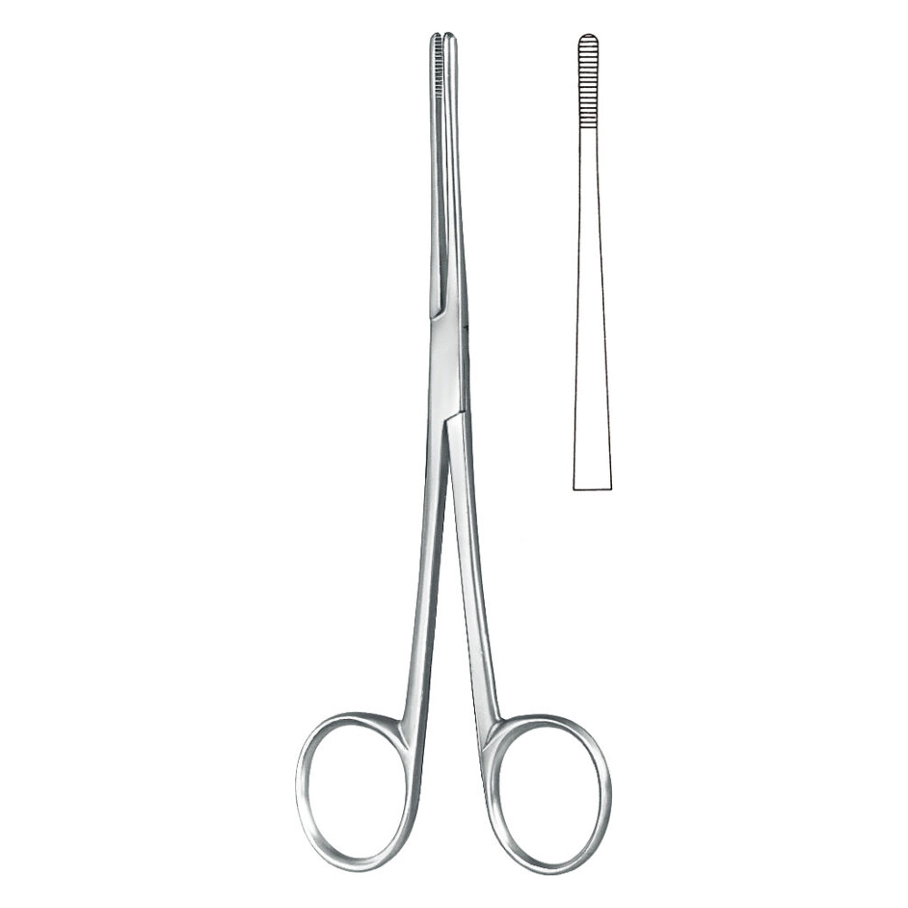 - Often features serrated jaws to secure tissue or sponges during procedures