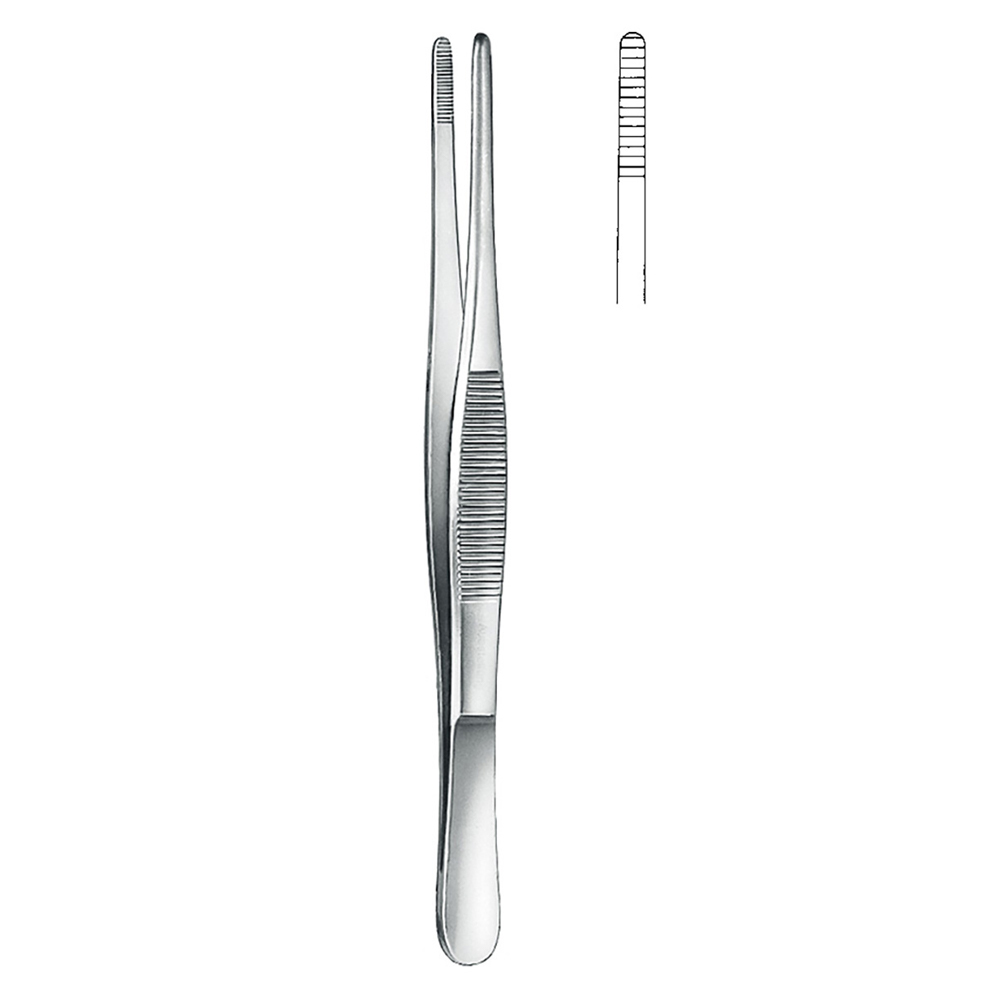 • Flat Tips: Features flat, broad tips designed for grasping and handling dressings, gauze, and other materials without damaging them.